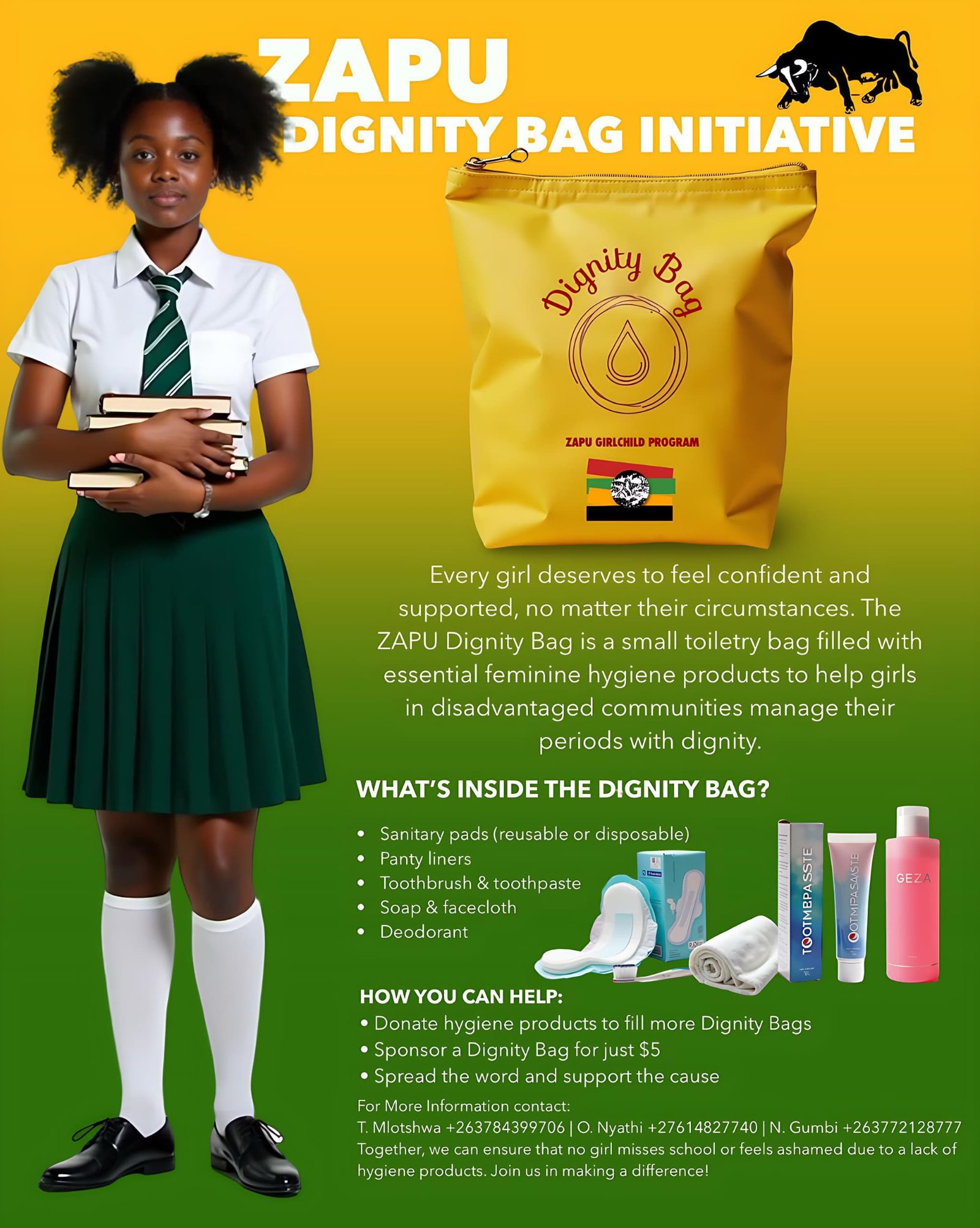 ZAPU is also appealing for donations towards Dignity Bags, a critically needed facility to give rural girls access to sanitary wear and basic personal hygiene products. Various donation channels have been opened.